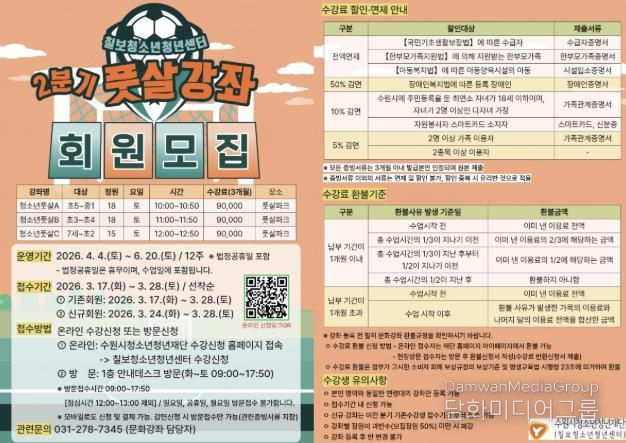 시민행정신문 강갑수 기자 | 수원시청소년청년재단 칠보청소년청년센터는 지역 청소년들의 건강한 여가 생활과 체력 증진을 위해녪년 2분기 문화강좌(풋살 교실)’수강생을 모집한다고 밝혔다.