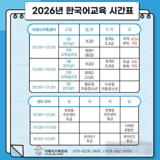 시민행정신문 강갑수 기자 | 거제시가족센터는 결혼이민자와 외국인, 중도입국자녀의 한국생활 적응과 안정적인 정착 지원을 위해 5일부터 한국어 교육을 순차적으로 개강한다고 밝혔다.