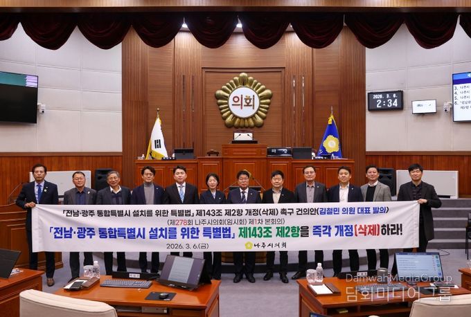 시민행정신문 강갑수 기자 | 나주시의회는 3월 6일 제278회 임시회 제1차 본회의를 열고 ''전남광주통합특별시 설치를 위한 특별법' 제143조 제2항 삭제 촉구 건의안'을 채택했다.