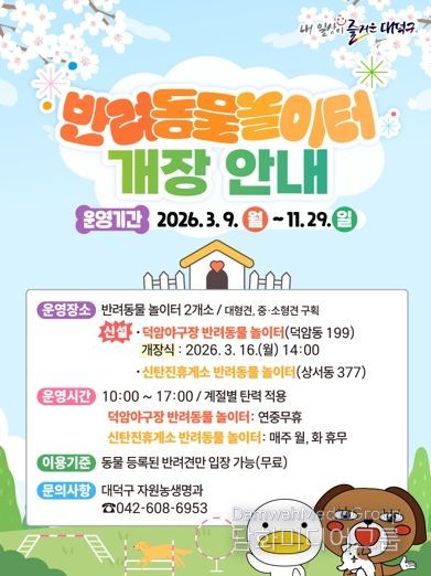 대덕구 관계자는 “반려동물 놀이터 운영을 통해 반려인과 반려동물이 함께 여가를 즐길 수 있는 환경을 조성하고자 한다”며 “앞으로도 반려동물 친화적인 도시 환경 조성과 성숙한 반려문화 확산을 위해 노력하겠다”고 말했다.