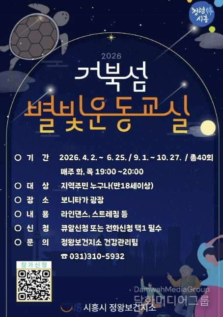 시민행정신문 기자 | 시흥시는 지역주민의 신체활동 증진과 생활터 중심의 건강관리 지원을 위해 오는 4월 2일부터 거북섬동 보니타가 광장(MTV 3호광장)에서 ‘2026년 거북섬 별빛운동교실’을 운영한다.