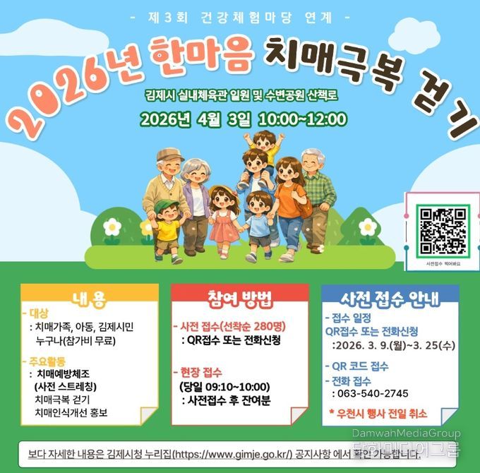 시민행정신문 강갑수 기자 | 김제시 치매안심센터는 치매에 대한 올바른 인식 확산과 치매친화적 지역사회 조성을 위해 '2026 한마음 치매극복 걷기 행사'참가자를 모집한다고 밝혔다.