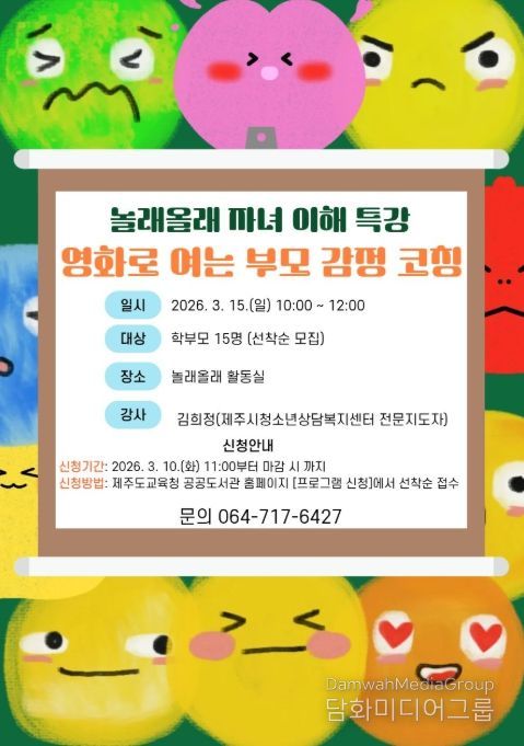 시민행정신문 기자 | 제주도교육청 제주도서관은 15일 보호자를 대상으로 자녀와의 건강한 소통을 돕기 위한 ‘놀래올래 자녀 이해 특강 : 영화로 여는 부모 감정 코칭’을 운영한다.