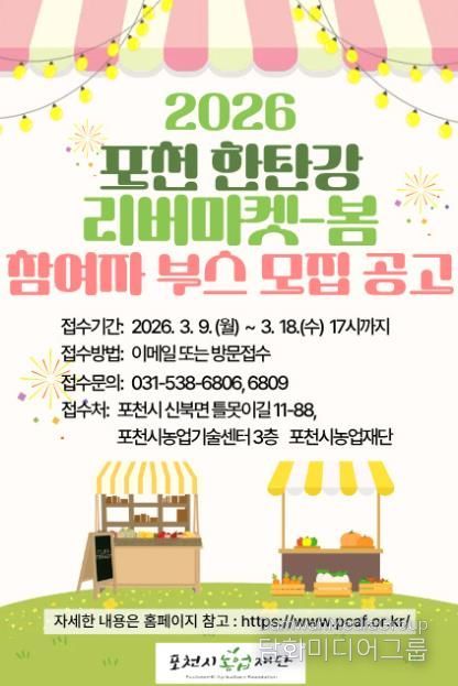 시민행정신문 강갑수 기자 | 포천시농업재단은 오는 5월 한탄강 생태경관단지에서 열리는 ‘2026년 포천 한탄강 리버마켓-봄’ 행사에 참여할 부스 운영자를 공개 모집한다.