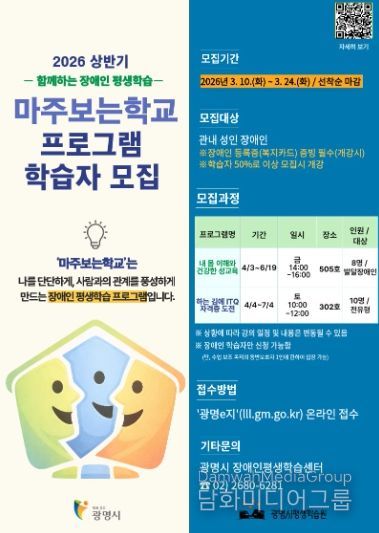시민행정신문 강갑수 기자 | 광명시 평생학습원은 장애인 학습자의 자기 이해와 사회 참여 역량 강화를 위한 평생학습 프로그램 ‘마주보는학교’의 상반기 수강생을 오는 24일까지 모집한다.