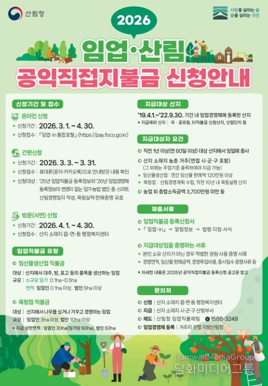 시민행정신문 강갑수 기자 | 부여군은 오는 4월 30일까지 2026년 임업·산림 공익직접지불금 신청을 받고 있다고 밝혔다.