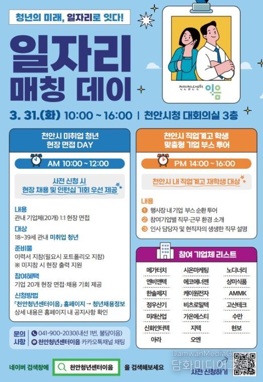 청년일자리 매칭데이는 청년의 취업을 돕고 지역 정착 기반을 마련하기 위해 오는 31일 천안시청 대회의실에서 열린다.