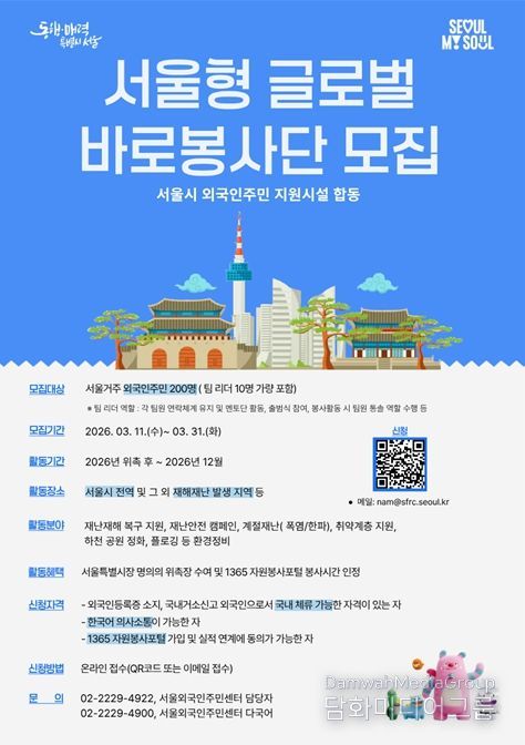 서울시는 '글로벌 바로봉사단' 참여자를 3월 11일부터 31일까지 모집한다. 신청 대상은 서울에 거주하는 외국인 주민(유학생, 직장인, 결혼이주민 등)으로 외국인등록증 또는 국내거소신고 등 국내 체류 자격을 갖추고 한국어 의사소통이 가능한 경우 지원할 수 있다.