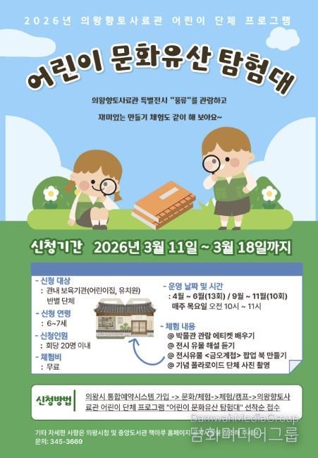 시민행정신문 강갑수 기자 | 의왕시 향토사료관이 오는 4월부터 6월, 9월부터 10월 매주 목요일에 어린이 단체 체험프로그램 ‘어린이 문화유산 탐험대’를 운영한다.
