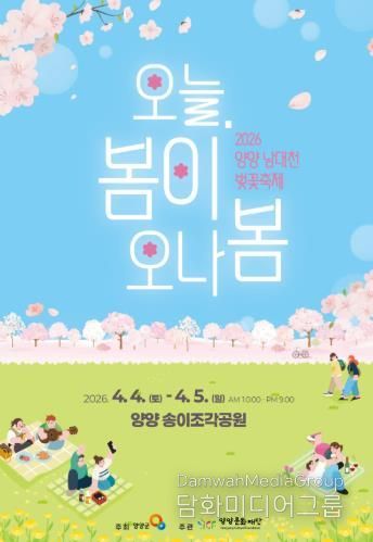 양양군과 양양문화재단은 오는 4월 4일부터 5일까지 이틀간 남대천 송이조각공원 및 인접 도로 일원에서 ‘2026 양양 남대천 벚꽃축제’를 개최한다고 밝혔다.