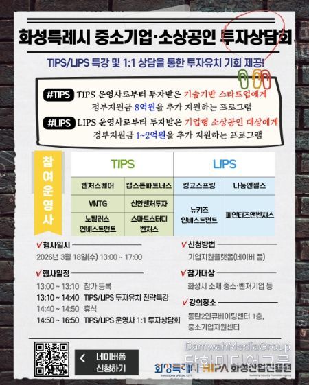 ‘화성특례시 중소기업·소상공인 투자상담회’는 화성시 중소기업 및 소상공인의 투자유치 역량 강화를 지원하기 위해 마련됐으며, TIPS(Tech Incubator Program for Startup) 및 LIPS(Licorn Incubator Program for Small brand) 프로그램을 중심으로 운영된다.