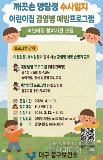 시민행정신문 기자 | 대구 중구보건소(소장 황석선)는 영유아의 올바른 손씻기 습관 형성과 감염병 예방 인식 향상을 위해 어린이집 대상 교육 프로그램 ‘깨끗손 명탐정 세균 수사일지’를 운영한다.