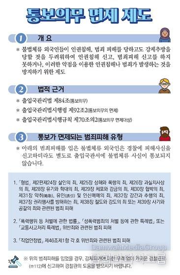 또한, 외국인은 범죄피해를 당하더라도 불법체류 등 강제추방등을 우려해 피해신고를 기피하고 있어 범죄피해 불법체류 외국인 통보의무 면책제도를 현장 대면 홍보 활동으로 적극 홍보하고, 외국인 근로자에 대한 범죄피해 신고 활성화로 불법행위는 끝까지 추적하여 엄정하게 사법처리 할 예정이다.