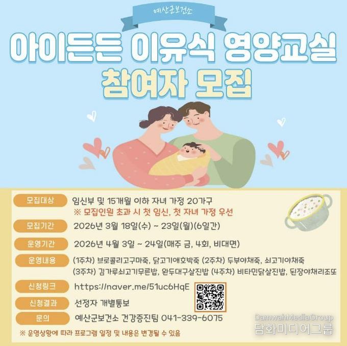 시민행정신문 기자 | 예산군보건소는 임신부와 영유아 가정의 올바른 이유식 시작과 건강한 식습관 형성을 위해 3월 18일부터 23일까지 군에 거주하는 임신부와 15개월 이하 영유아를 둔 가정을 대상으로 ‘아이든든 이유식 영양교실’ 참여자를 모집한다고 밝혔다.