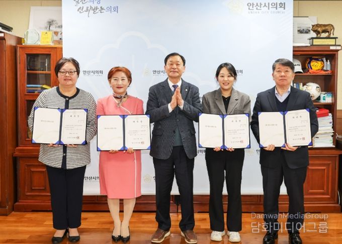 시의회는 17일 의장실에서 박태순 의장과 신임 소식지 편집위원들이 참석한 가운데 수여식을 개최하고 현옥순 의회 의회운영위원회 부위원장과 장기준 투데이안산 대표, 우인경 이동 지역사회보장협의체 위원, 이은빈 의회 입법지원팀 정책지원관 등 4명을 소식지 편집위원으로 위촉했다.