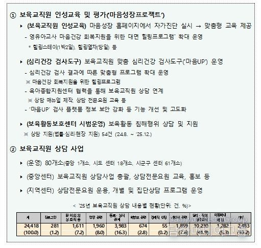첫째, 중앙·지방 육아종합지원센터에 보육교직원의 보육활동을 보호·지원하는 전담조직을 둘 수 있도록 법적 근거를 마련했다. 이를 통해 보육교직원이 부당하게 보육활동 침해를 당하는 경우 전담조직을 통해 심리·법률지원 등 보호·지원을 받을 수 있도록 했다.