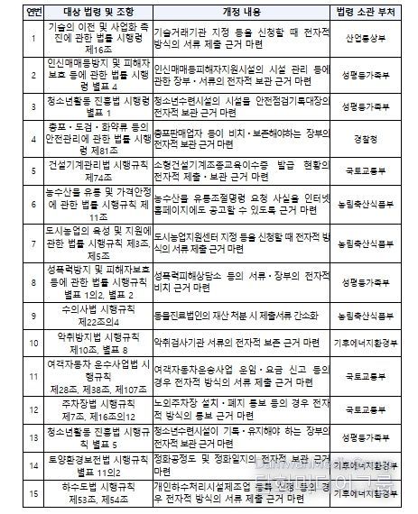 그동안 '민원 처리에 관한 법률' 등에 따라 전자적 방식으로 각종 서류를 제출ㆍ보관할 수 있음에도, 국민들이 이러한 규정을 알지 못해 서류를 실물로 제출ㆍ보관하는 경우가 있었다. 이와 같은 국민 불편을 해소하기 위해 서류의 제출ㆍ보관 의무를 규정하고 있는 '기술의 이전 및 사업화 촉진에 관한 법률 시행령' 등 4개 대통령령에 직접 전자적 방법으로 서류를 제출ㆍ보관할 수 있도록 하는 근거를 마련했고, '건설기계관리법 시행규칙' 등 11개 부령에도 동일한 근거를 마련하여 3월 24일 공포될 예정이다.