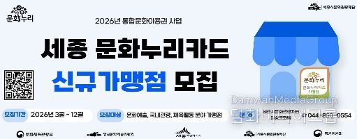 시민행정신문 강갑수 기자 | 세종시문화관광재단은 문화누리카드 이용자의 편의를 높이고 이용처를 확대하기 위해 신규 가맹점을 모집한다고 밝혔다.