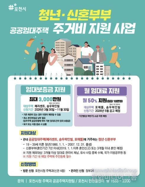 시민행정신문 강갑수 기자 | 포천시는 관내 공공임대주택에 거주하는 청년 및 신혼부부를 대상으로 ‘2026년 청년·신혼부부 공공임대주택 주거비 지원사업’을 시행한다.