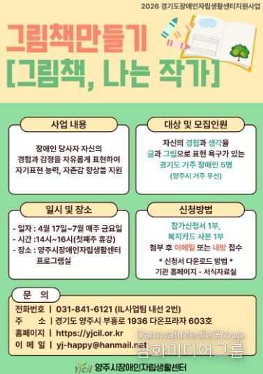 시민행정신문 기자 | 양주시장애인자립생활센터에서는 장애인의 문화·예술 참여 기회를 확대하고 자기 표현의 장을 마련하기 위해 그림책 만들기[그림책, 나는 작가] 참가자를 모집한다.