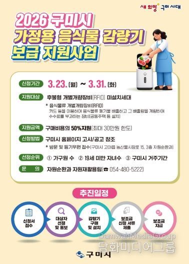 시민행정신문 김학영 기자 | 구미시는 음식물류 폐기물 관리 사각지대를 해소하고 배출 편의를 높이기 위해 ‘가정용 음식물 감량기 보급 지원사업’을 추진한다.