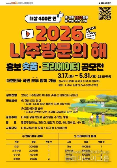 나주시 관계자는 “이번 공모전은 자유로운 형식의 영상 콘텐츠를 통해 나주의 매력을 새롭게 알리고 창의적인 홍보 콘텐츠를 발굴하기 위해 마련했다”며 “많은 국민이 참신한 영상으로 ‘2026 나주방문의 해’ 홍보에 함께해 주길 바란다”고 말했다.