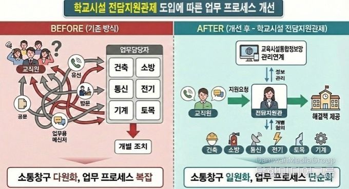 특히 기존에는 학교에서 공사 감독이나 시설관리와 관련한 문제가 발생하면 토목․건축․기계․전기․소방 등 분야별 담당자를 각각 찾아 개별적으로 문의해야 하는 등 절차가 복잡하고, 전문적인 기술지원을 받는 데에도 어려움이 있었다.