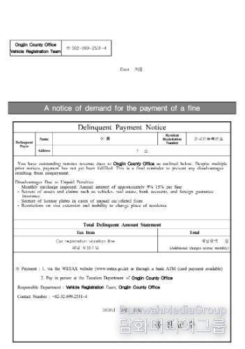 시민행정신문 강갑수 기자 | 옹진군이 자동차 과태료 외국인 체납자들을 대상으로, 영어로 번역된‘자동차 과태료 체납 안내문’을 발송한다고 밝혔다.