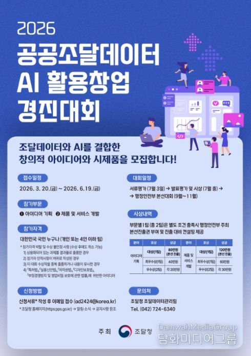 시민행정신문 이세훈 기자 | 조달청은 20일 '2026년 공공조달데이터·AI 활용 창업경진대회' 계획을 공고하고, 6월 19일까지 참가 신청을 접수한다.