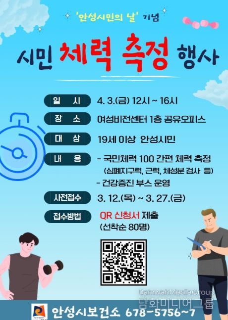 이번 행사는 오는 4월 3일 오후 12시부터 4시까지 안성시 여성비전센터 1층 공유오피스에서 진행된다. 현장에서는 체력 측정뿐만 아니라 심뇌혈관 질환 예방, 신체활동, 금연, 구강 관리 등 건강 인식 향상을 위한 다양한 건강증진 부스도 함께 운영될 예정이다.