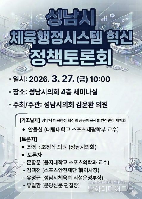 시민행정신문 기자 | 성남시의회 김윤환 의원(문화복지체육위원회)은 오는 27일, 성남시 체육행정의 혁신 방향을 모색하기 위한 '성남시 체육행정시스템 혁신 정책토론회'를 개최한다고 밝혔다.