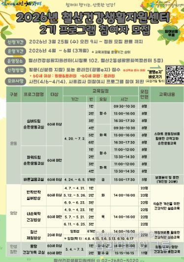 시민행정신문 기자 | 광명시 보건소 철산건강생활지원센터가 ‘2026년 건강생활 프로그램 2기’ 참가자를 오는 25일 오전 9시부터 선착순 모집한다.