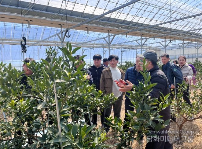 오후에는 관내 만감류 재배 농가 8개소를 순회하며 현장 컨설팅을 실시했다. 각 농가별 재배환경과 생육 상태를 직접 점검하고, 수세 불균형 해소, 착과 관리, 시설 내 환경 조절 등 농가별 문제점에 대한 맞춤형 기술 지도가 이뤄졌다.
