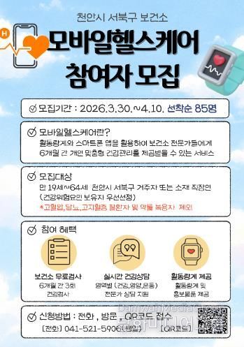 시민행정신문 기자 | 천안시 서북구보건소는 오는 30일부터 ‘모바일 헬스케어’ 사업 참여자를 모집한다고 25일 밝혔다.