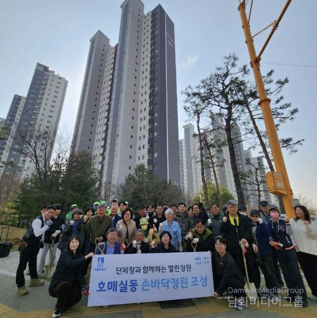 시민행정신문 강갑수 기자 | 지난 24일, 수원시 권선구 호매실동은 쾌적한 마을 환경 조성과 도심 속 정원 문화 확산을 위해 아파트 단지 인근 유휴지에 ‘손바닥 정원’을 조성했다.