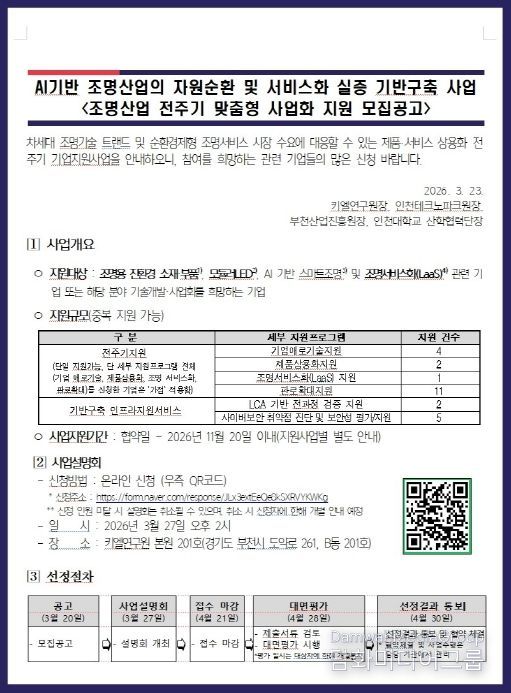 이번 사업은 인천광역시와 부천시 등 지자체를 비롯해 주관기관인 키엘연구원, 부천산업진흥원, 인천대학교가 함께하며, 친환경·디지털 전환 흐름에 맞춰 조명산업의 자원순환 구조를 구축하고 서비스 기반 산업으로의 전환을 돕기 위해 마련됐다.