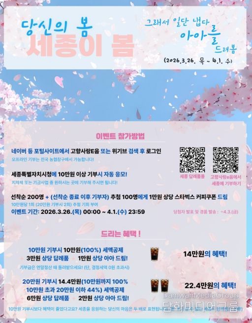 행사 기간 중 세종 고향사랑기부제에 10만 원 이상을 기부할 경우 선착순 200명과 선착순 당첨자를 제외한 기부자 중 추첨 100명에게 1만 원 상당 커피쿠폰을 제공한다.