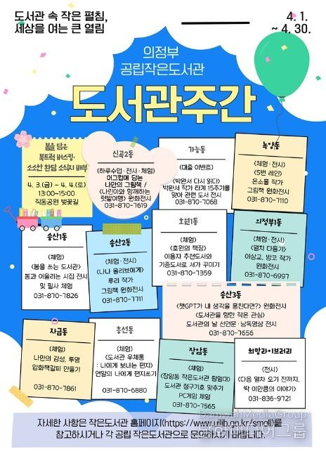의정부시 공립 작은도서관에서는 ‘도서관 속 작은 펼침, 세상을 여는 큰 열림’을 주제로 머그컵에 담는 나만의 그림책, 원화 전시, 독서 이벤트 등 다양한 독서문화 프로그램을 마련해 시민들에게 풍성한 독서 경험을 제공할 계획이다.