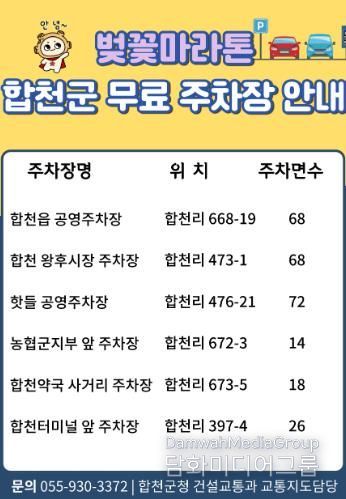 주차장 무료개방과 관련한 자세한 사항은 합천군 건설교통과 교통지도담당으로 문의하면 된다.
