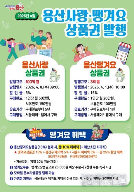 박희영 용산구청장은 “이번 용산사랑·땡겨요상품권 발행이 봄철 장보기와 외식, 생활비 부담을 덜어주는 데 도움이 되길 바란다”며 “지역 내 소비를 촉진해 골목상권에 활력을 불어넣고 따뜻한 봄기운이 확산되길 기대한다”고 말했다.