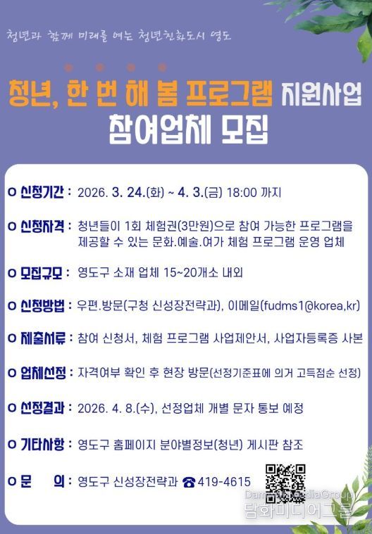시민행정신문 강갑수 기자 | 부산 영도구는 청년들에게 다채로운 문화 향유의 기회를 제공하고 지역 청년 문화를 활성화하기 위해 '2026년 청년, 한 번 해 봄 프로그램 지원 사업'을 추진한다고 밝혔다.