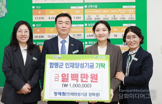 정 씨는 기부 배경에 대해 “함평군 인재양성기금 장학금을 학기 중 총 7회를 지원받아 학비 부담 없이 학업에 전념할 수 있었다”며 “취업 성공 이후 ‘지역에서 받은 도움을 다시 돌려주고 싶다’는 뜻에서 후배들을 위해 인재양성기금을 기탁하게 됐다”고 전했다.