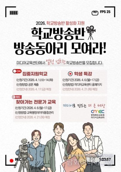 시민행정신문 기자 | 충청북도교육청 직속기관 교육연구정보원(원장 이찬동) 미디어교육센터는 학교 방송활동 활성화와 학생 미디어 제작 역량 강화를 위해 '2026 학교방송반 활성화 지원' 프로그램을 운영한다.