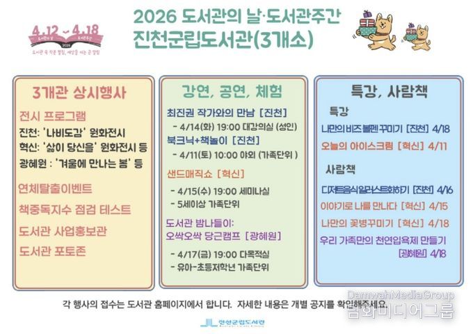 시민행정신문 기자 | 충북 진천군립도서관은 ‘2026 도서관의 날·도서관 주간’을 맞아 4월 11일부터 18일까지 관내 3개 도서관(진천군립·생거진천혁신도시·광혜원)에서 다양한 독서문화 행사를 운영한다.