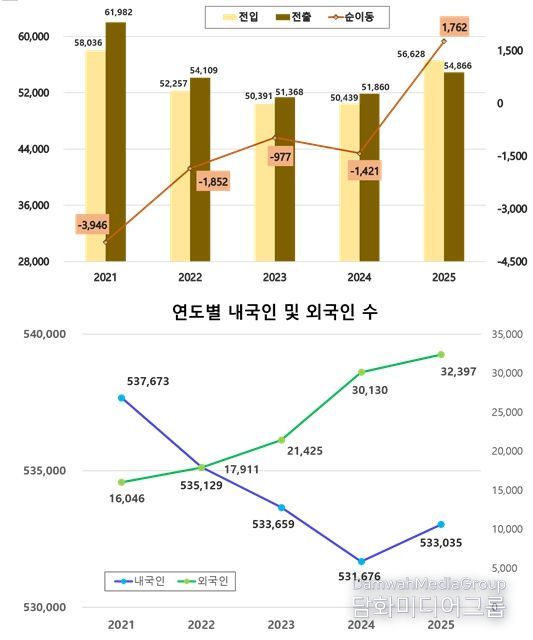 특히 내국인 인구는 53만3,035명으로 전년 대비 1,359명 증가하며 2020년 이후 지속되던 감소세에서 벗어나 반등세로 전환됐다.