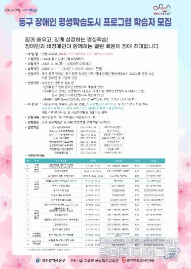 시민행정신문 강갑수 기자 | 광주 동구는 교육부 국립특수교육원이 주관하는 ‘2026년 장애인 평생학습도시 운영 사업’ 특성화 부문에 선정돼 장애인을 위한 맞춤형 평생학습 프로그램을 본격적으로 추진한다고 밝혔다.