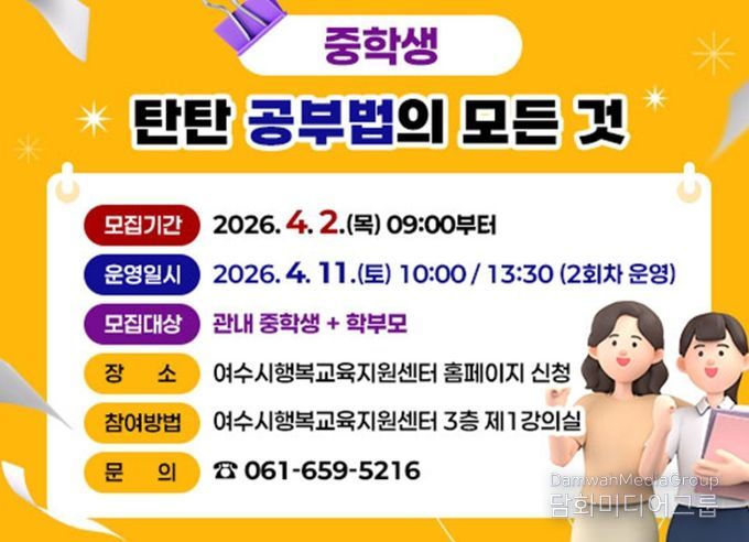 시민행정신문 강갑수 기자 | 여수시가 오는 4월 11일 여수시행복교육지원센터에서 관내 중학생과 학부모를 대상으로 ‘중학생 탄탄 공부법의 모든 것’ 특강을 개최한다.