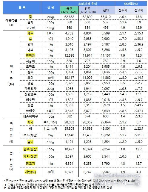점검 결과, 농산물은 대부분 품목이 전년대비 낮은 수준이며, 전주대비 하락세로 아직까지 중동전쟁에 따른 가격 영향은 미미한 것으로 나타났다. 가격이 낮은 당근, 양배추, 양파 등에 대해서는 수급안정대책을 추진 중이며 소비촉진(할인지원 등)도 병행 추진하고 있다.