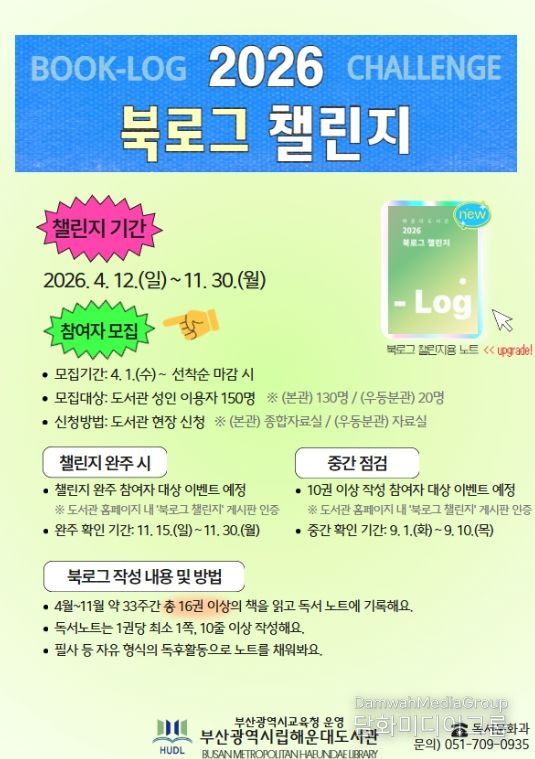 노장석 해운대도서관장은 “북로그 챌린지를 통해 시민들이 독서와 기록을 꾸준히 실천하며 사고력과 표현력을 함께 키울 수 있기를 기대한다”고 말했다.