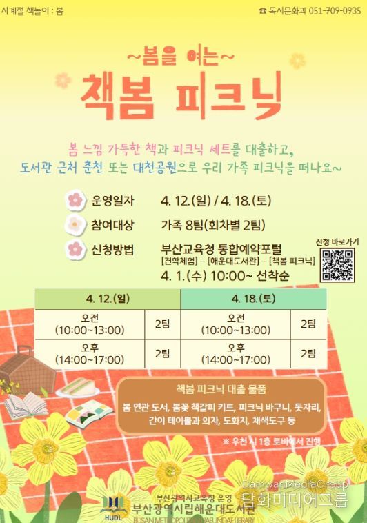 시민행정신문 기자 | 부산광역시립해운대도서관은 오는 4월 12일과 18일 해운대도서관 인근 자연 공간에서 가족 8팀을 대상으로 봄 야외 독서문화행사 ‘봄을 여는 책봄 피크닉’을 운영한다.